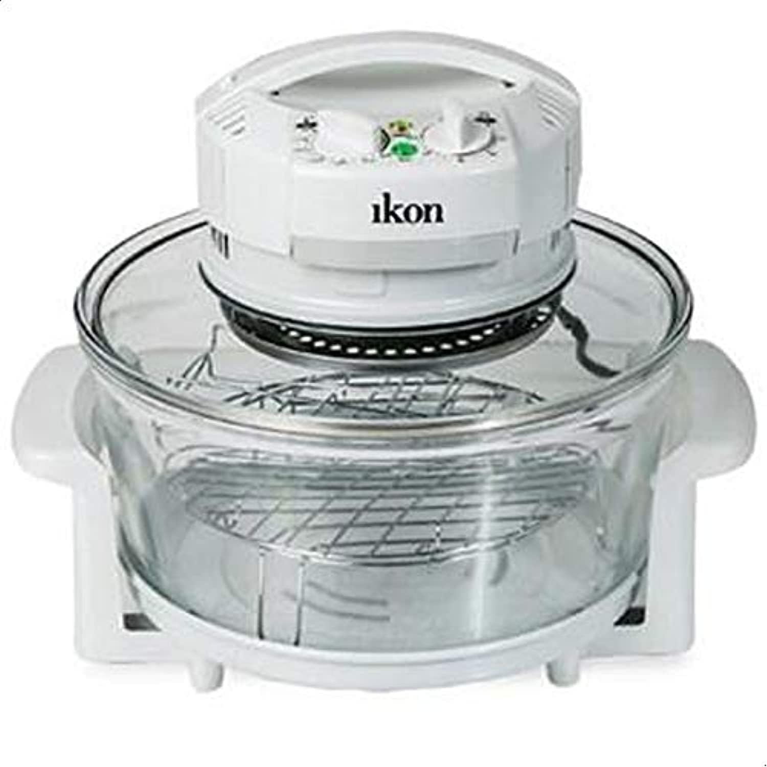 ຮູບທີ 1: Ikon IK-9210 Halogen Convection Oven. This image shows the complete unit, including the white control head with the Ikon logo, the clear glass bowl, and the metal racks inside. The handles on the side of the glass bowl are also visible.