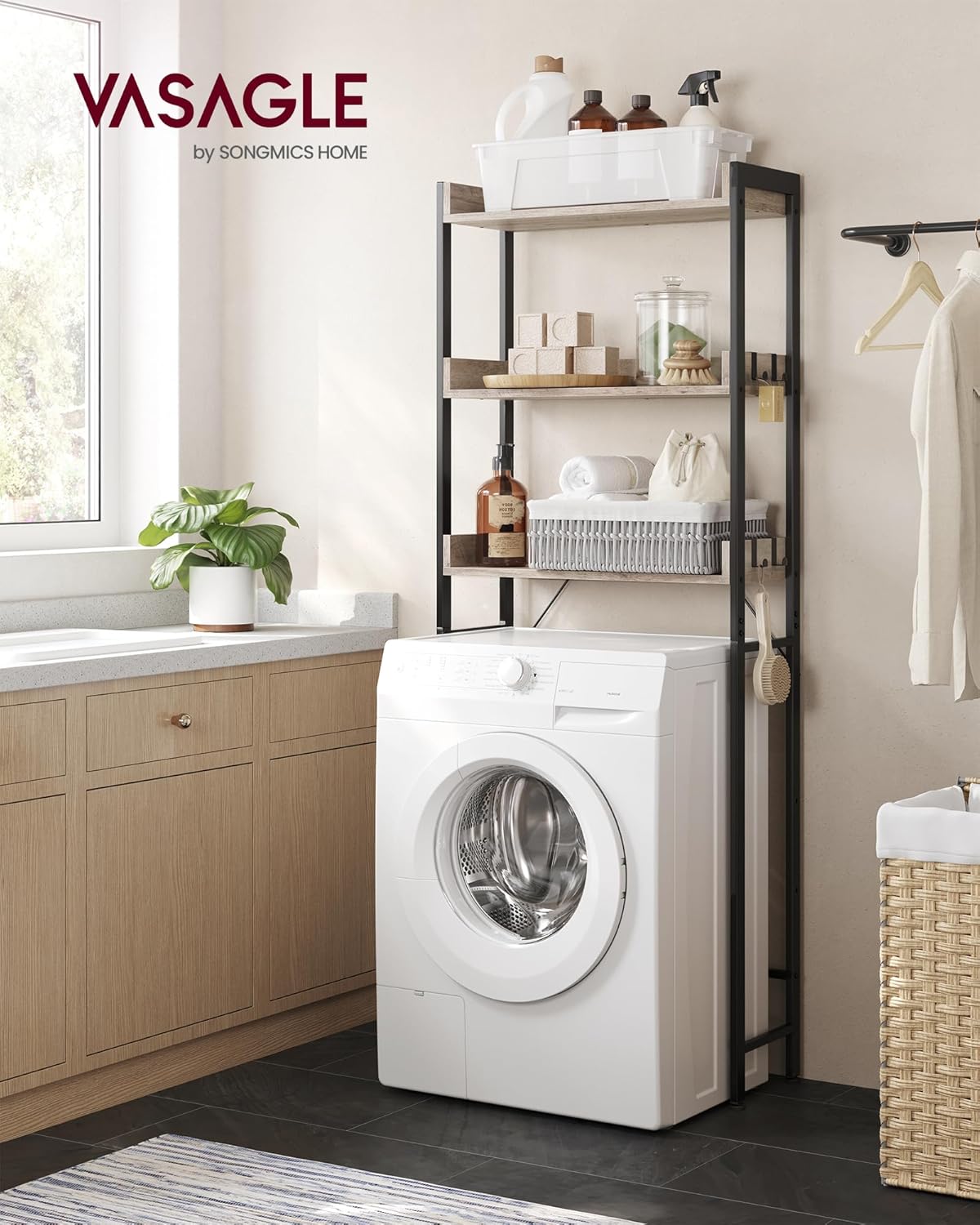 - ການນໍາໃຊ້ຫຼາຍຈຸດປະສົງ: This unit can also be used over a washing machine, storage basket, or trash can. It functions effectively as a laundry organizer, plant stand, or kitchen shelf.