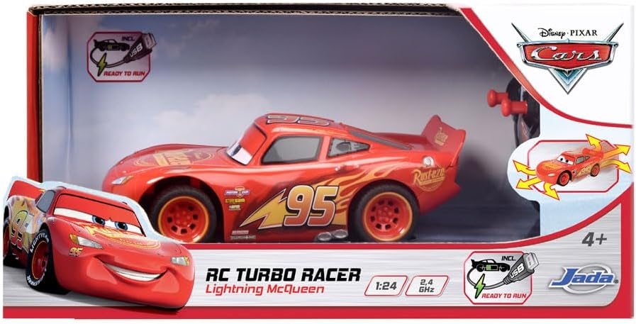 The Jada Lightning McQueen RC Car features a 2-channel remote control for intuitive operation.