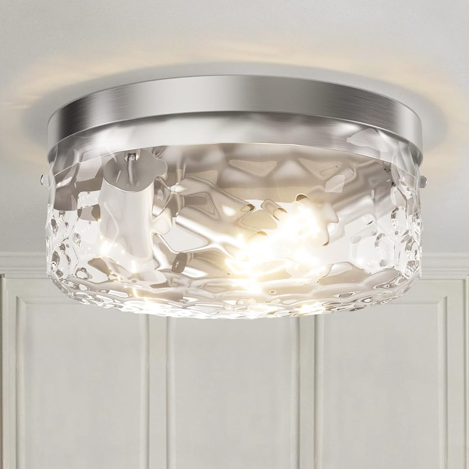 ຮູບພາບ: ທາງຫນ້າ view of the Maxax Nickel 12" Ceiling Light, showcasing its hammered glass and nickel finish.