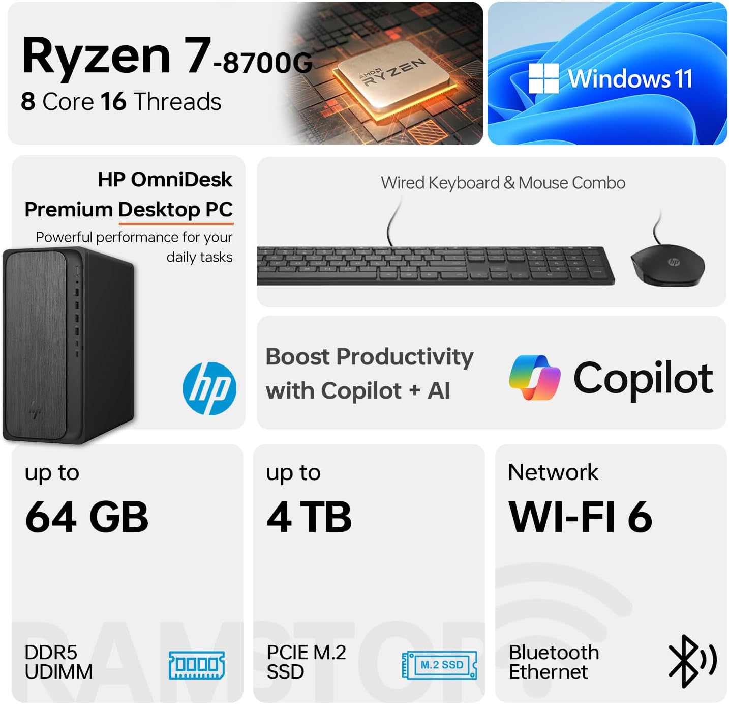 Image 1.1: HP OmniDesk M02 Tower Desktop highlighting its AMD Ryzen 7 8700G processor, Windows 11 operating system, Wi-Fi 6 connectivity, and memory/storage capabilities.